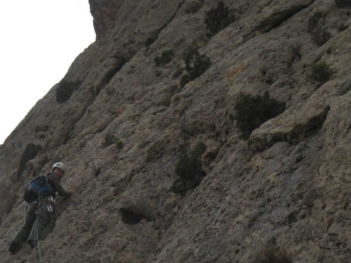 El segon llarg possiblement és el més difícil de la via, tot i que els passos claus estan ben assegurats. Aquí comencem a notar la poca qualitat de la roca. Potser, a mida que es vagi repetint la via s’anirà netejant progressivament. Un cop superem la part més vertical la via va cap a l’esquerra fins arribar a la reunió. 8 parabolts i 50 metres.