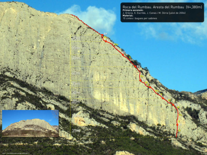 La Roca Rumbau, o Roca del Moro com la coneix la gent d’Oliana, és una imponent cinglera de conglomerat que s’alça a ponent d’Oliana, tot just abans de l’embassament. Per desgràcia, el conglomerat que hi trobem, és en general, d’una qualitat molt discreta. Tot i així, “L’Aresta del Rumbau” ens permet fruir de l’escalada en aquesta imponent roca.