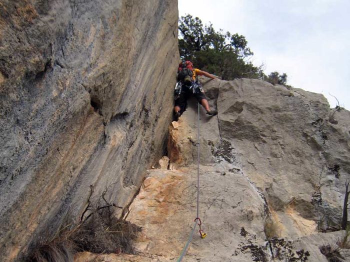 Sortim de la reunió en diagonal cap a la dreta. De seguida trobem una placa ben vertical. Aquí comença el tram d’artificial fins uns pocs metres abans de la reunió. Aquesta es fa en un còmode replà. 20 metres.