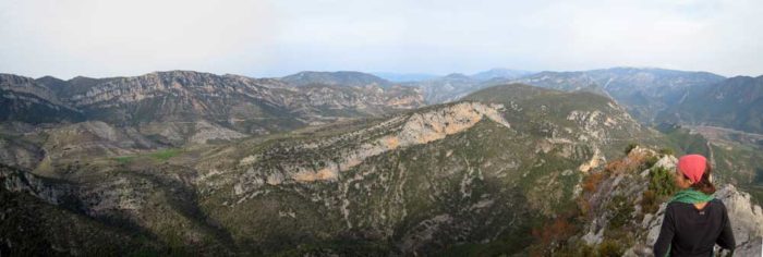 Hem de crestejar cap a l’esquerra seguint marques vermelles fins arribar a un coll (n’haurem passat un abans) Baixem del coll fins a trobar el camí de pujada en el punt de les marques grogues. Una hora.