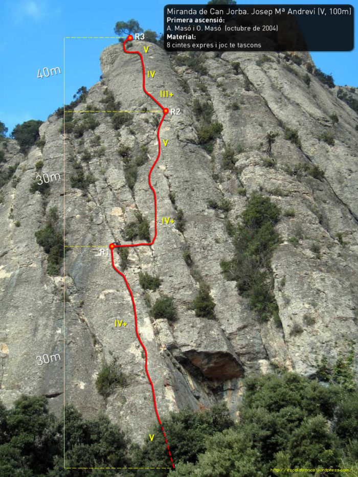 A la Miranda de Can Jorba trobem mitja dotzena de vies de dificultat baixa, encarades cap al sud-est, fet que ens assegura sol i bones temperatures a l’hivern. L’Andreví és una via de tall clàssic oberta pels germans Masó, lògica i amb roca prou acceptable. L’equipament, suficient, es pot completar amb algun tascó.