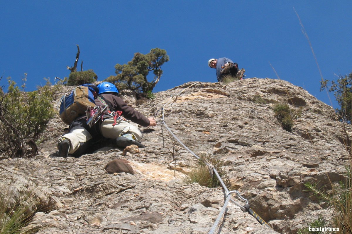 La darrera tirada comença tombada, hem d’anar amunt fins a trobar un ressalt més vertical, però ben protegit amb un clau. Un cop superat anem en diagonal a l’esquerra fins arribar a un pi on fem l’última reunió. 40 metres.