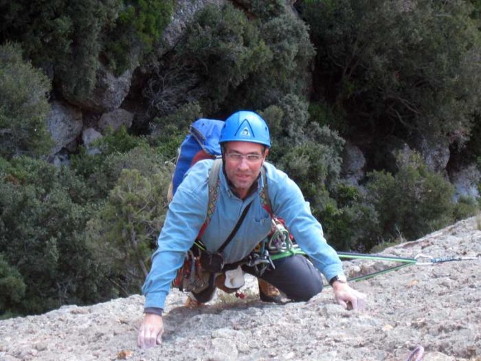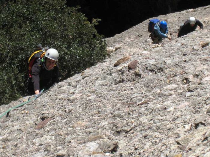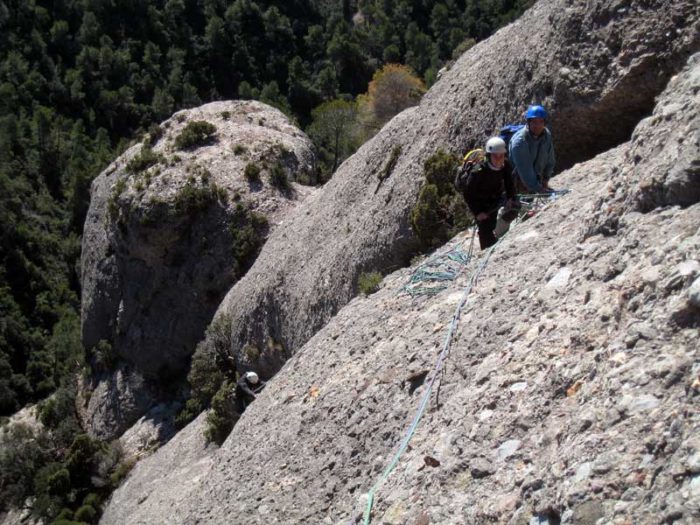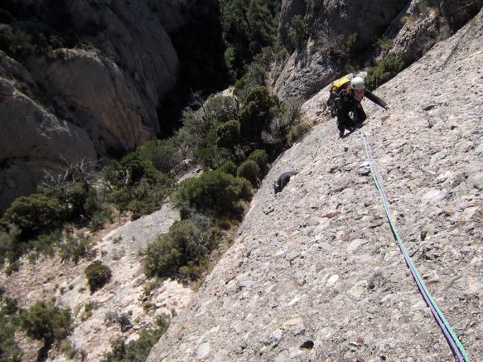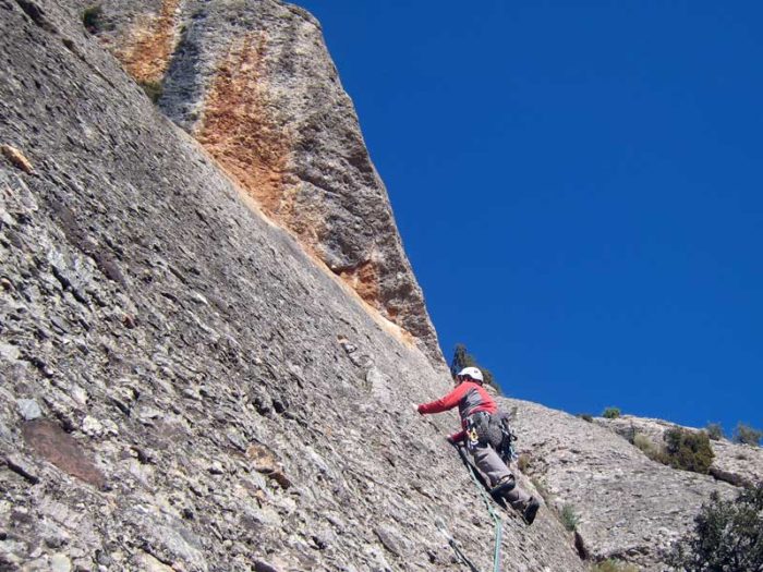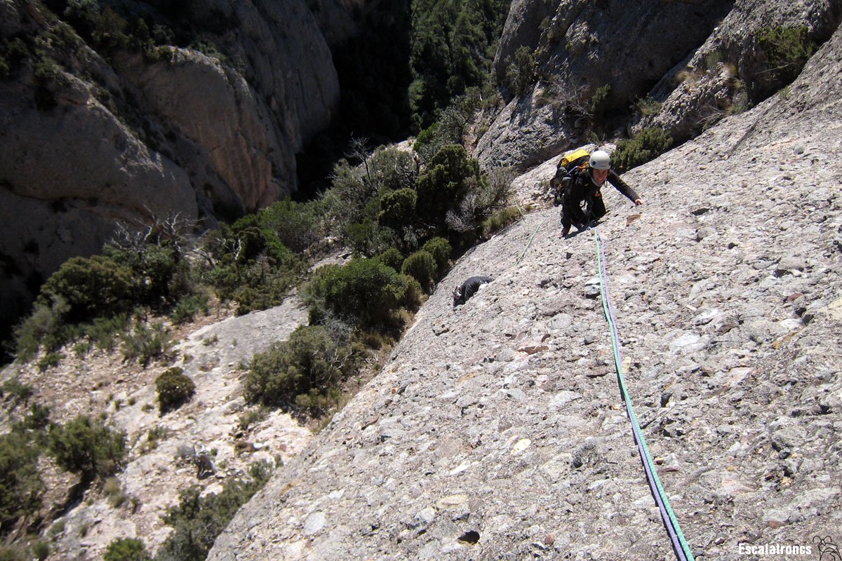 hem de sortir en diagonal cap a la dreta (no confondre’ns amb l’Escabroni que va recte) i després recte amunt. A meitat del llarg trobem el pas de V, un resalt ben protegit i amb molt bona presa. Un cop superat continuem amunt fins a la reunió, que també coincideix amb la segona reunió de l’Escabroni. 30 metres.