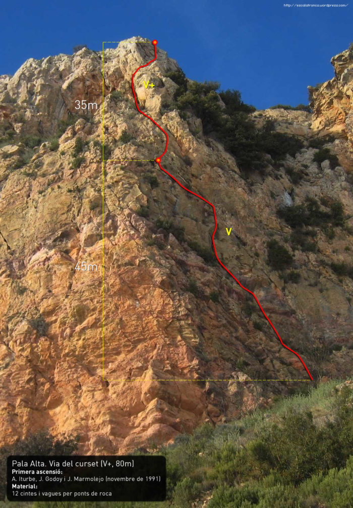 Pel nom i la llargària la via del Curset pot semblar poca cosa. Res més lluny de la realitat, es tracta d’una via de dificultat mitja, sostinguda i variada. Ideal per combinar amb itineraris més llargs de la Pala Alta, com ara el Diedre Blanqueta o la Mariola Motors. El traçat del segon llarg difereix força de la via original, donat que va haver-hi un despreniment. Via recomanable.