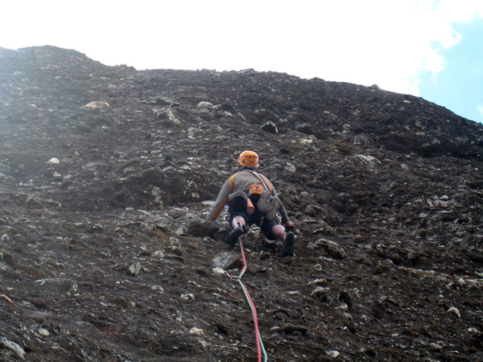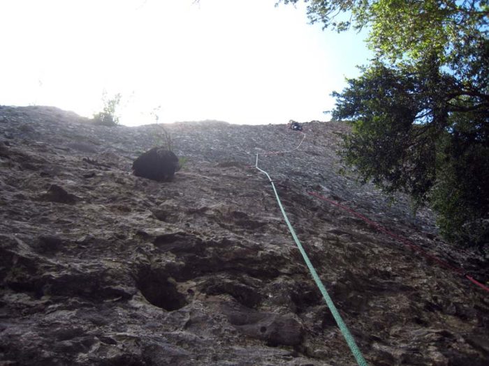 Sortim recte amunt i comencem el festival de grans còdols. La tirada és més tombada que l’anterior i si li afegim l’abundància de presses ens surt un llarg tot diversió. 25 metres.