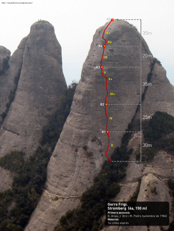 Situada a la vessant nord del Gorro, la Stromberg és una via freda, ideal per quan comença a apretar la calor. Verticalitat, qualitat i quantitat de presses i un equipament molt generós, ens fan fruir de l’escalada sense patiments del primer a l’últim metre. Escalada del tot recomanable, potser la millor via de Gorro.