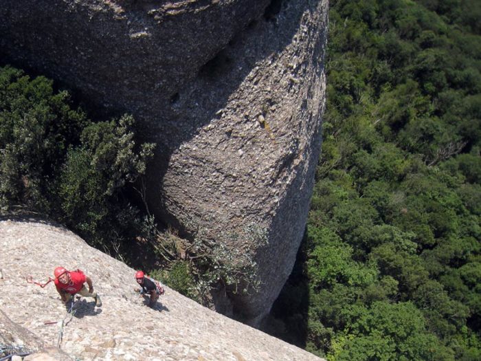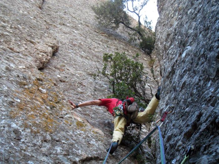 La sortida de la reunió pot ser la part més fina d’aquesta tirada, però la proximitat de les assegurances dona molta confiança. Després d’aquests primers metres ens situem sota un gran llavi que flaquegem cap a l’esquerra fins trobar un punt més dèbil que ens permet superar-lo en artificial. Un cop situats sobre el llavi queda una placa fàcil fins la reunió. 20 metres.