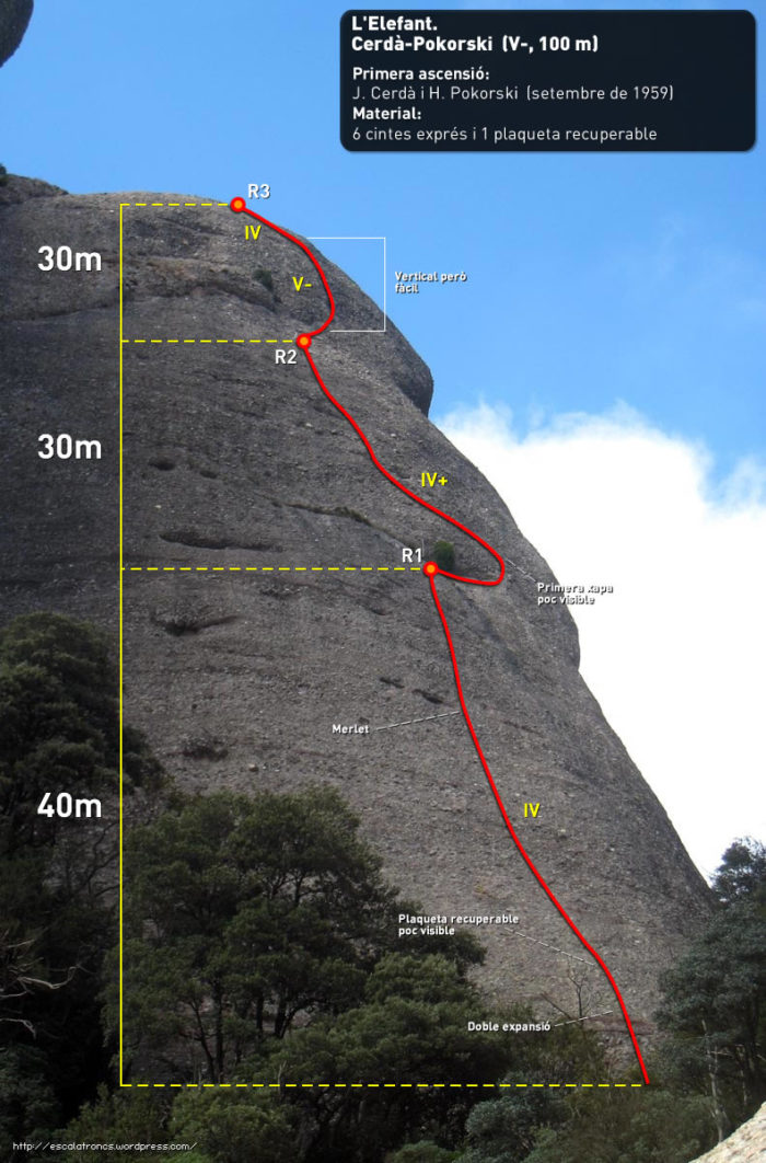 - Material: 6 cintes exprés, una plaqueta recuperable i opcionalment vagues per llaçar merlets i un camalot nº2 per la sortida de la primera reunió