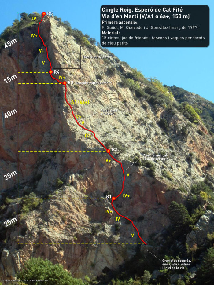 - Material: 16 cintes exprés. Tot i que la via es pot fer amb el que hi ha posat, no estarà de més dur un joc de friends i/o tascons i un parell de cordinos per algun clau amb forat petit.
