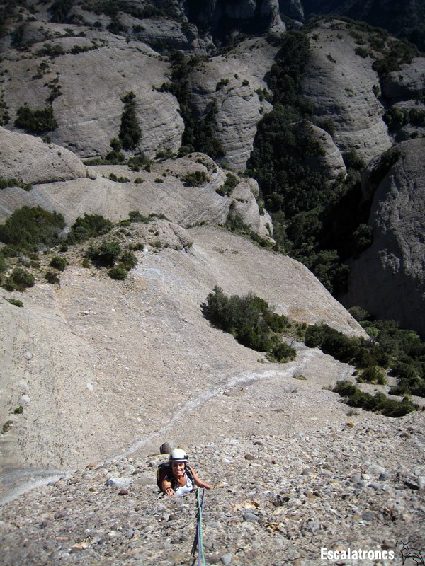 Sortim cap a l’esquerra flaquejant fins que trobem el primer punt d’assegurança. Des d’aquí hem d’anar pujant més o menys recte direcció un arbust. Just davant es troba la reunió. 55 metres. Des d’aquest punt sortim caminant i anem a buscar l’inici de la segona part de la via. Abans d’abastar l’inici del llarg haurem de fer una fàcil grimpada.
