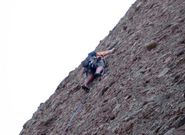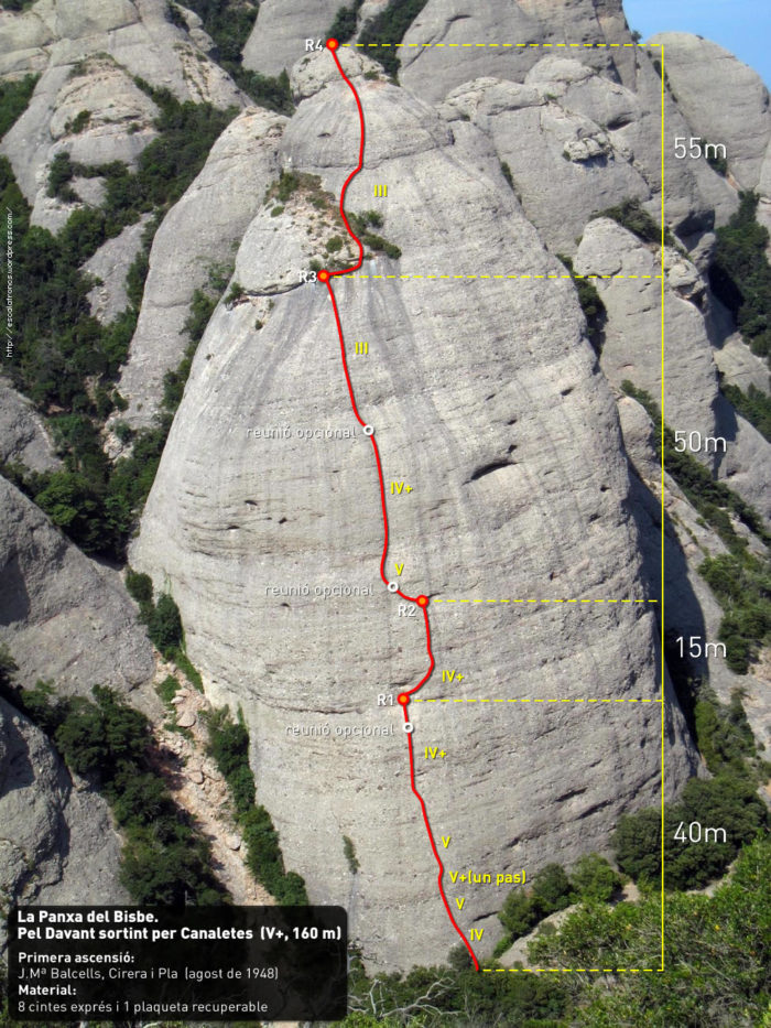 Aquest llarg ens porta fins al cim de la Panxa del Bisbe. Es tracta d’una fàcil grimpada pel terreny més sencill que trobem. Al cim no hi ha reunió, però hi ha uns caps de burí i si portem plaquetes recuperables podem usar-les per la reunió. 55 metres.