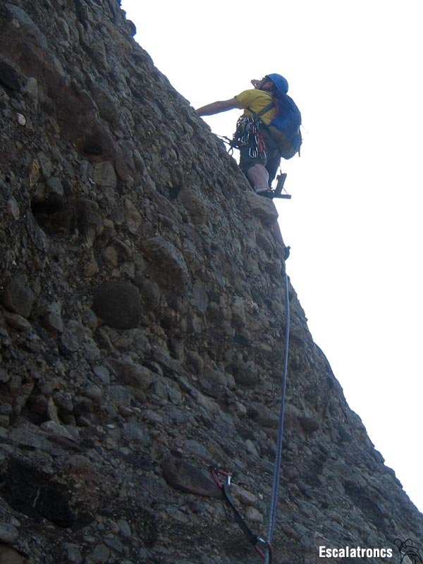 La via comença al peu del camí, a l’esquerra d’una balma característica. Els primers metres escalem en diagonal a l’esquerra fins que la paret es posa vertical. A partir d’aquest punt venen uns pocs metres més fins (V+) per seguir amb una escalada sostinguda de V sobre roca exel·lent. Quan portem trenta metres escalats trobarem una primera reunió una mica precària, la ignorem i al cap de pocs metres en trobarem una altra amb millors condicions i força còmoda. 40 metres. En aquest primer llarg podem posar una plaqueta recuperable.