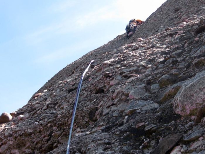 Sortim en diagonal a la dreta i travessem una franja de roca no tant bona. Un cop superada seguim recte amunt per arribar al cap d’uns metres a la següent reunió. Aquesta tirada és molt curta i podríem seguir fins una altra reunió que hi ha tot just abans de començar la canaleta.