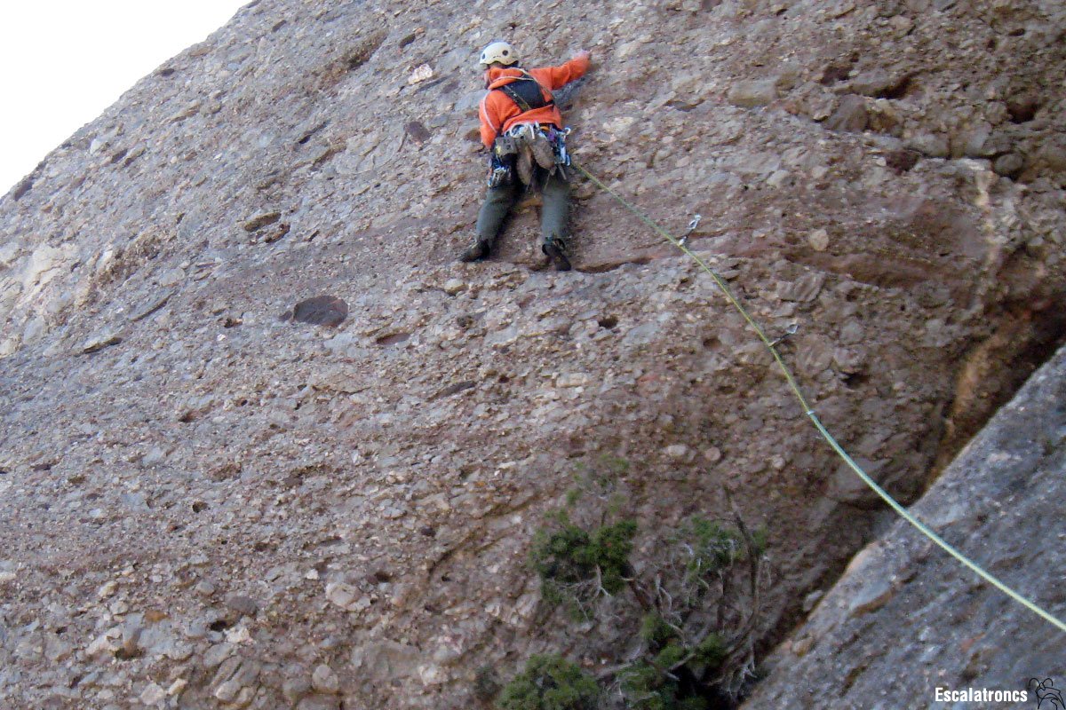 Sortim de la reunió fent un llarg flanqueig cap a l’esquerra en direcció a una savina, fàcil però una mica exposat. Un cop estiguem a l’alçada de la savina ataquem una panxa amb bona presa. La paret escup bastant però la presa és de primera i les assegurances es troben molt aprop.