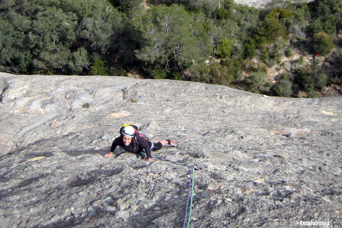 Sortim de la reunió recte amunt per terreny tombat fins que arribem a un petit mur. Ens hi enfilem i el superem amb un pas de decisió sobre presa petita. El pas està molt mal protegit donat que si caiem anem directes a la lleixa… Així que no s’hi val caure!! 20 metres.