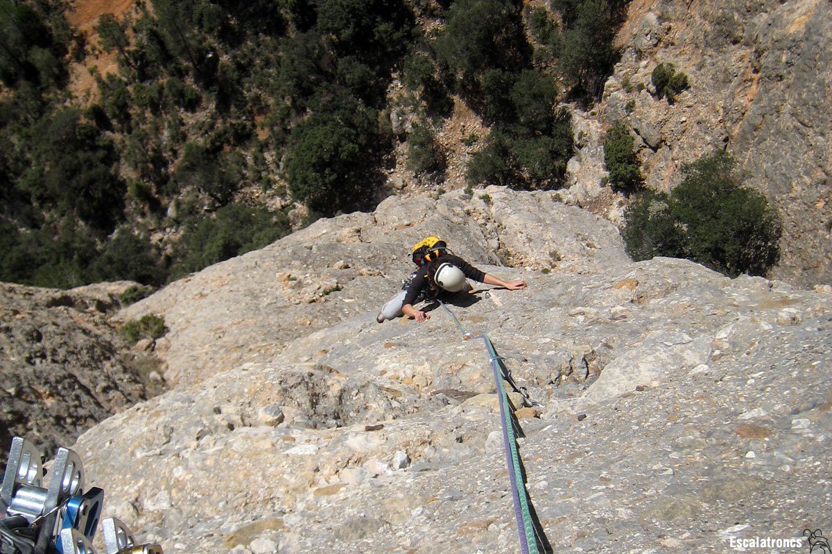 Sortim de la reunió i de seguida trobem una savina que podem llaçar. Segueixen uns metres fàcils fins una nova savina. Just passada aquesta segona savina iniciem un flanqueig cap a l’esquerra, on va bé obrir-se de cames per atènyer bones preses de mans. Un cop superat el pas venen tot un seguit de panxetes, ja amb bona roca, amb l’obligació d’escalar entre xapes. Menció especial per la darrera panxa, que un cop superada ens deixa a un llavi per sortir cap a la dreta amb un pas d’adherència i equilibri en que amb prou feines tenim alguna mà. 35 metres.