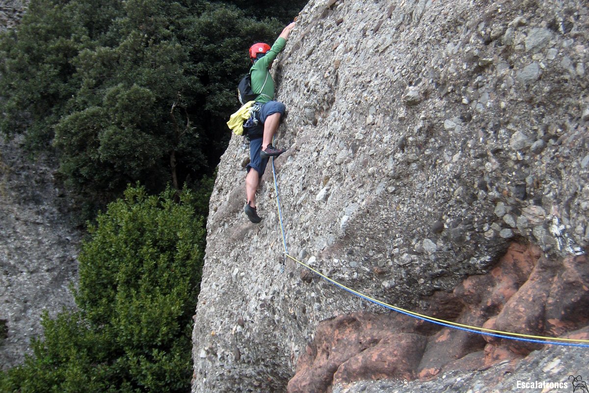 Tornem a anar cap a l’esquerra fins que sortim de la balma. Tenim un pas de V- abans de poder xapar la primera expansió, així que hem d’anar al tanto perquè si caiem el pèndol és important. Un cop xapada superem un primer tram vertical per seguir després per una agradable placa inclinada amb molt bona roca fins la reunió.
