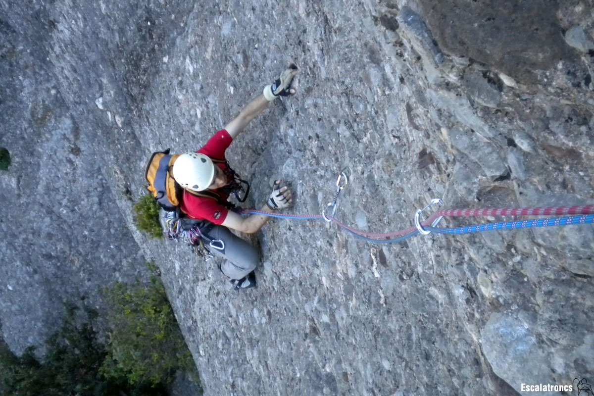 Sortim en diagonal a l’esquerra per anar a xapar el primer espit, que es troba a l’inici de la panxa que haurem de superar per situar-nos a la placa. Un cop xapat anem per l’esquerra de l’assegurança, on trobarem bons forats. Superar aquesta panxa és el pas clau de la tirada. Un cop sobre la placa ens queda un bon tram d’escalada molt vertical, sobre forats i roca de primera, on haurem d’anar fent ziga-zagues per trobar la millor presa. Passat el tram més potent la paret va perdent lleugerament verticalitat fins arribar a la reunió. 30 metres.