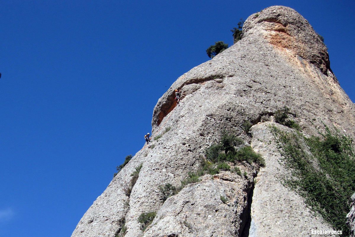 De vegades hi ha línies que resten incomprensiblement verges fins que algú encerta a trobar la lògica d’un traçat que després ens resulta tant evident. És el que han fet els germans Masó amb aquesta bonica Aresta Brucs, estranyament oblidada, potser per trobar-se a un dels racons menys visitats del massís. La via consta de tres tirades prou sostingudes i variades (més una quarta de sortida), perfectament equipades i que ara surten completament en lliure, gràcies al sanejament sofert pel pas de les cordades. Una bona opció per gaudir d’un dels indrets més tranquils de Montserrat.