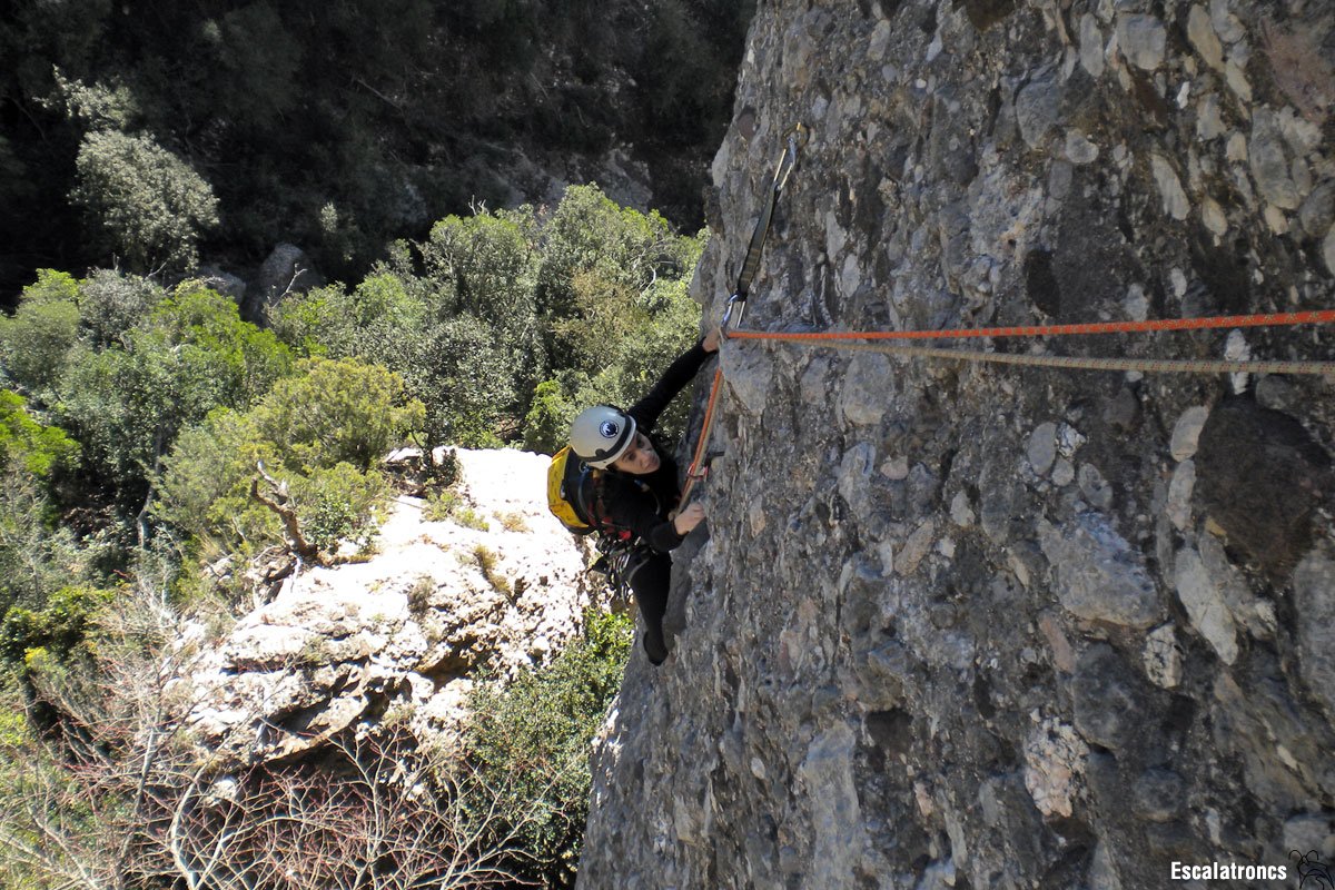 Un cop recuperat al company farem un curt i volat ràpel per la vessant nord de l’agulla, que ens deixarà al peu de la placa per on s’enfila la segona tirada. El llarg comença vertical i aquesta serà la tònica d’aquests 25 metres. La roca ens obligarà a anar fent ziga-zagues, cercant les millors preses i la millor postura, fent-nos escalar amb elegància i finura, però amb la tranquil·litat de tenir en tot moment una assegurança propera. 25 metres.