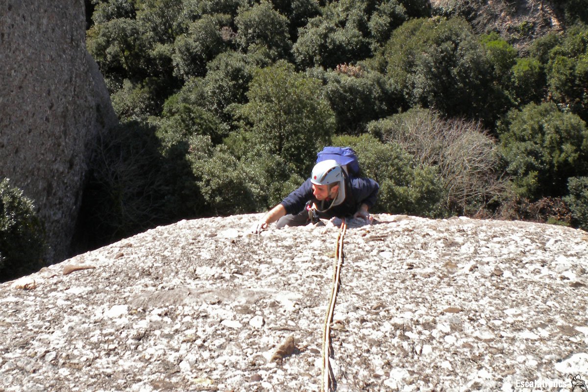Sortim cap a l’esquerra per anar a buscar un forat on hi entra un Camalot #0.75 a ‘cañón’. De seguida tenim uns passets verticals però amb bon cantell. Un cop superats queda un tramet fàcil fins un llavi que superem flanquejant cap a la dreta, per situar-nos sobre una placa vertical que demanà un darrer pas de decisió abans d’afluixar. Trobarem una reunió opcional que aprofitarem per assegurar-nos i seguir una quinzena de metres més sobre terreny fàcil per arribar a la darrera reunió. 45 metres, 3 parabolts i una reunió intermitja.