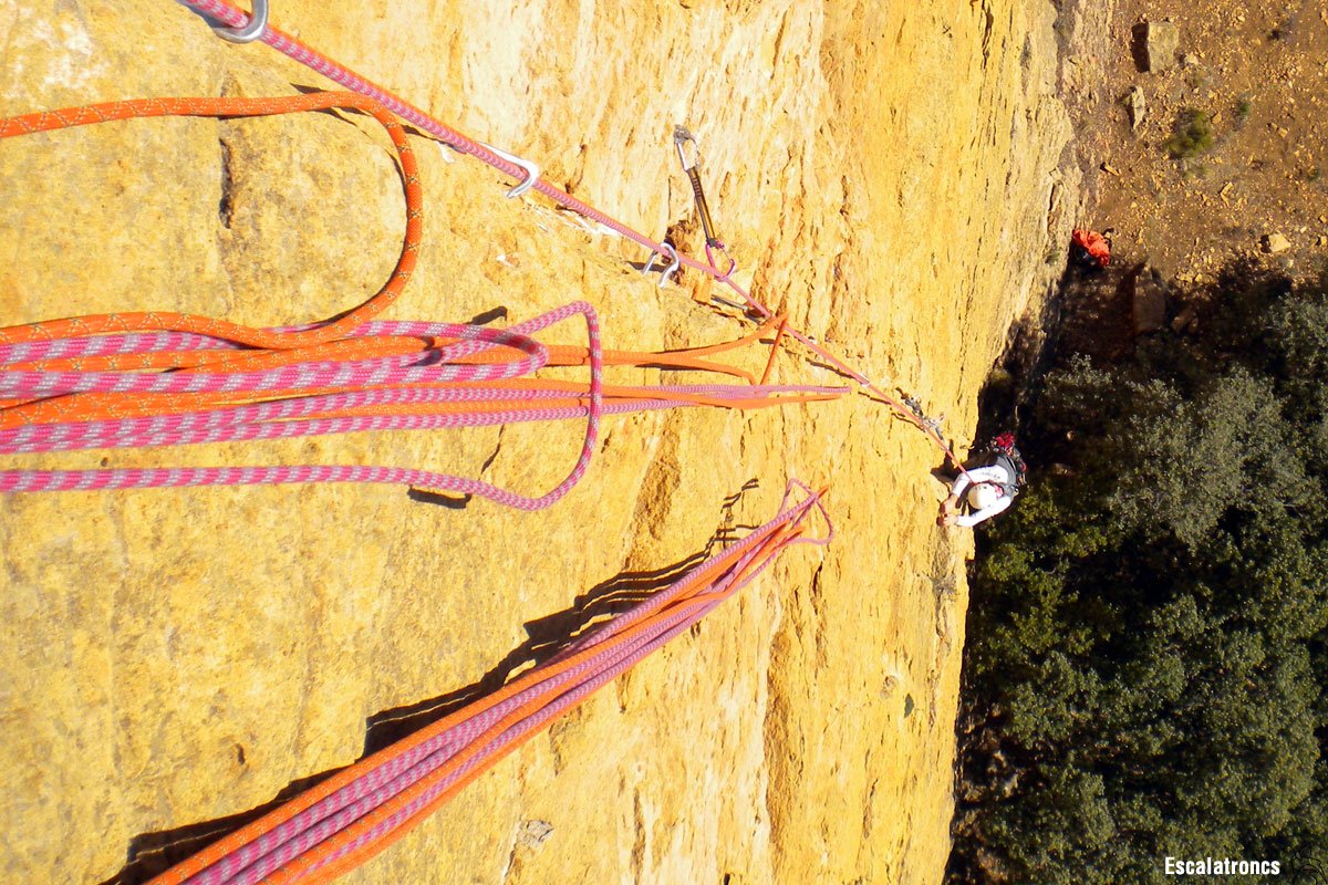 Només sortir de la reunió hem de superar una panxa que ens demanarà una mica de braços. Un cop sobre la placa tenim uns metres pel gaudi amb preses genials i bones possibilitats per assegurar-nos. Un cop arribem a un clau obliqüem uns metres a l’esquerra fins que en trobem un altre. A partir d’aquest punt seguim recte amunt per un mur de roca excel·lent i escalada atlètica fins la reunió. 30 metres.