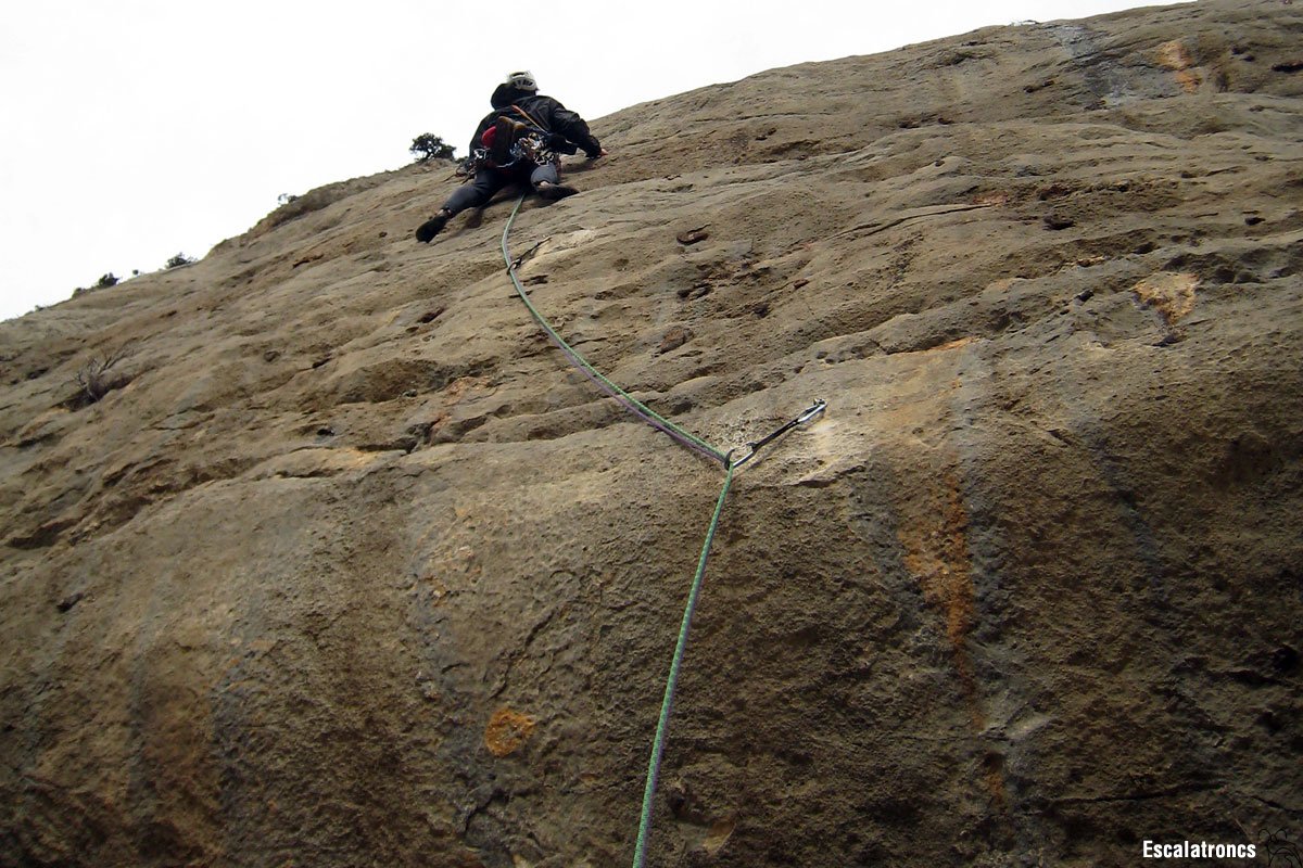El darrer llarg de la via és un rostoll per sortir de la paret, però haurem de parar compte amb la roca, que no sempre és bona. Farem la darrera reunió a l’arbre que millor ens vagi. 40 metres.
