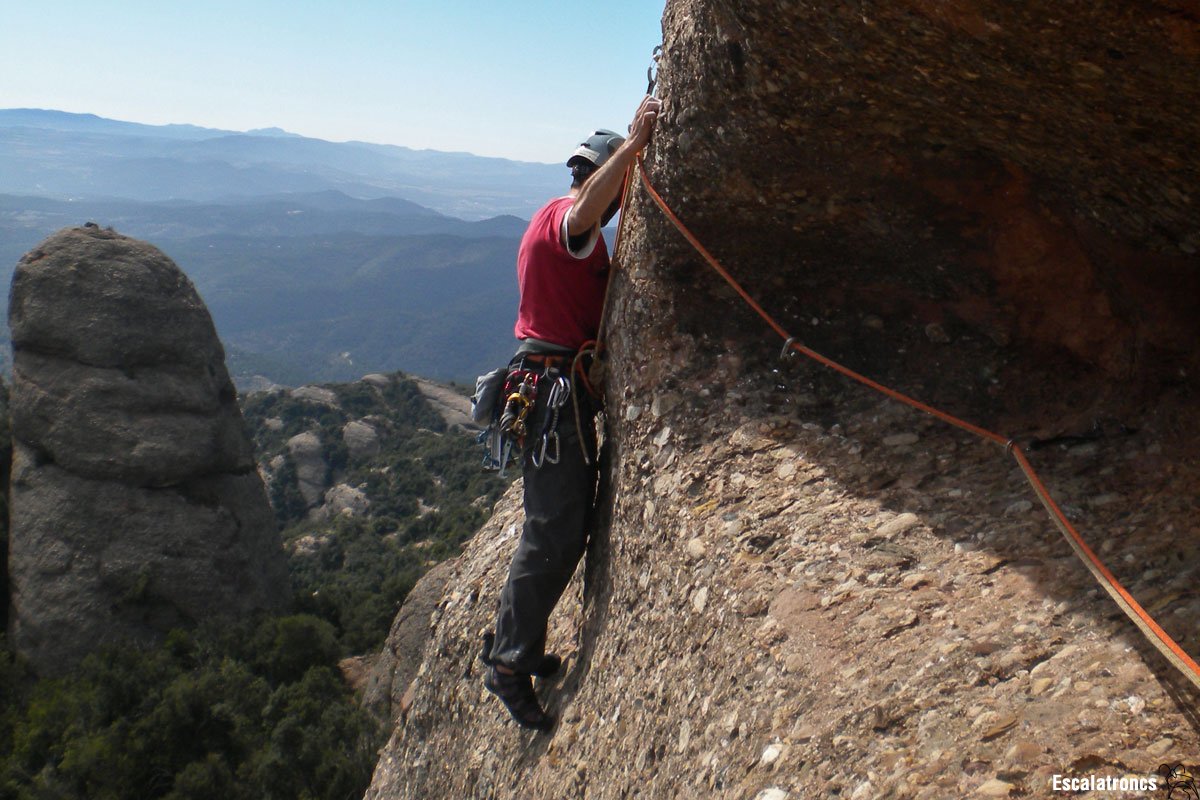 La via s’inicia enfilant-nos a un pedestal que ens avoca directament a la placa. Ja des del primer metre ens adonem quina serà la tònica de l’ascensió: presa petita i equilibri per anar guanyant-li metres a aquesta fabulosa agulla. De seguida encarem un preciós flanqueig a esquerres que ens mena a un llavi que haurem de superar amb un pas de força, per quedar sobre un mar de pedra on ens tocarà donar la talla, cercant el moviment més lògic, acariciant els còdols, mai massa grans i sobretot, posant a prova la resistència dels nostres bessons, fins arribar a la gran balma on muntarem la primera reunió. 35 metres.