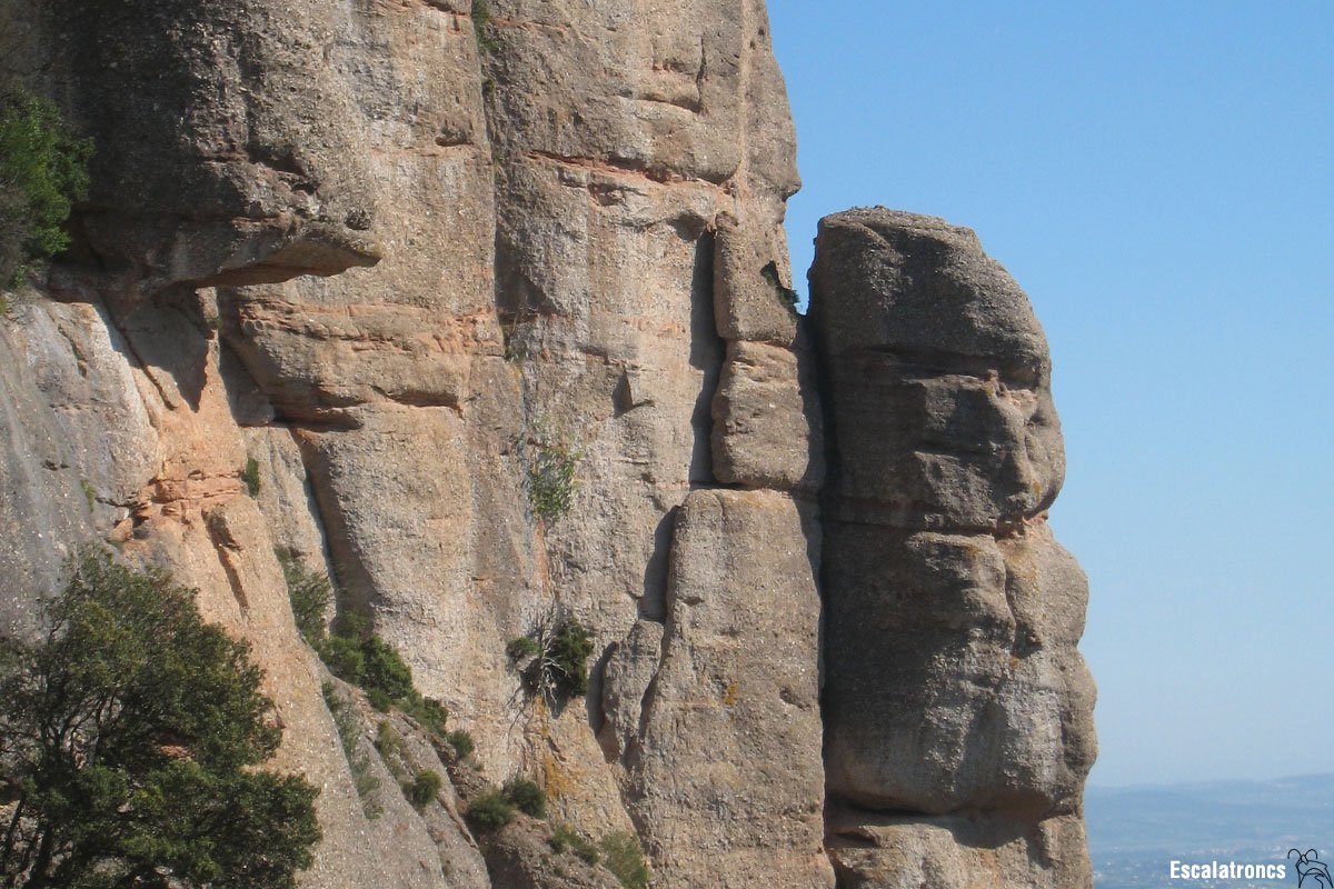 La via comença en artificial escalant una fissura desplomada que de seguida es posa vertical. Els passos són llargs i convida a alguna curta sortida en lliure, sinó es pot equipar bé la fissura entre passos amb friends o tascons. Ja al tram que es fa en lliure podem col·locar una plaqueta a un cap de burí. La reunió és còmoda i queda just davant de la gran llastra. 30 metres.