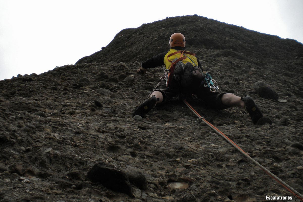 El segon llarg comença vertical i va cercant les parts més dèbils de la paret, zigzaguejant cap a l’esquerra per després tornar a la dreta. La roca en aquesta tirada és menys dolenta que a l’inici de la via i ens permet anar progressant en lliure. El tram més dret el trobem a la darrera part (6a o A0), són uns pocs metres que de seguida es tornen més amables fins entrar a la reunió. 30 metres.