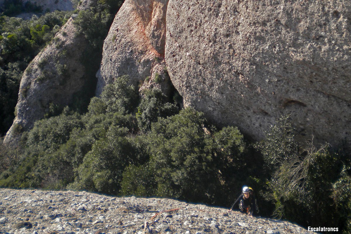 Un cop localitzada només ens hem d’enfilar a la paret i començar a gaudir de la bona roca que ens acompanyarà quasi tota la via. La tirada és fàcil, sempre amb preses agraïdes. Només ens haurem d’assegurar d’anar seguint el camí correcte, ja que les assegurances, col·locades amb molt bon criteri, mai són a tocar. A la segona meitat del llarg la placa es va rampant fins arribar a la reunió. 40 metres.