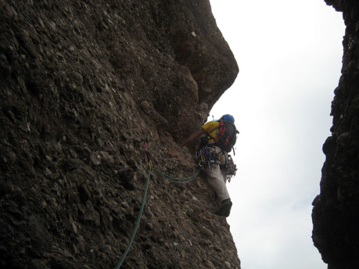 Hem de sortir cap a la dreta i introduir-nos entre la gran llastra i la paret. L’escalada és en ramonage i es fa al gust. Personalment vaig anar molt bé guanyant alçada a l’entrar i després anant en diagonal ascendent fins a la reunió, que és a l’altra banda de la llastra. Aquest llarg és net. Molt recomanable portar la motxilla i les sabates penjades entre les cames.