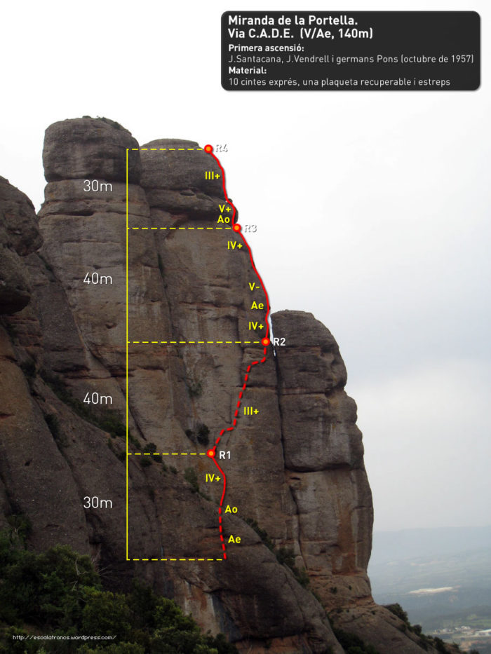 La CADE de la Miranda de la Portella és una petita gran clàssica oberta fa més de 50 anys que transcorre pel vessant oest d’aquesta agulla. La via, tot i no ser gaire llarga, ofereix una escalada variada i espectacular, amb trams d’artificial, un ramonage 100% clàssic i algun passatge en lliure prou interessant. És una bona opció per matins calorosos.