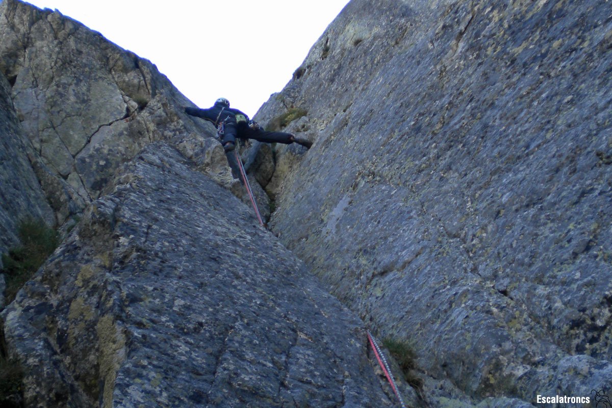 Ja situat a la base del diedre, l’ataquem sense contemplacions. L’escalada és molt agradable; primer el diedre és obert i un xic indefinit, però poc a poc es va tancant, sempre amb bona presa tant pels peus com per les mans. La tirada es troba força equipada a base de claus i una expansió. El pas clau el trobem pocs metres abans de la reunió, quan el diedre es va tancant i la presa és menys generosa. 50 metres.