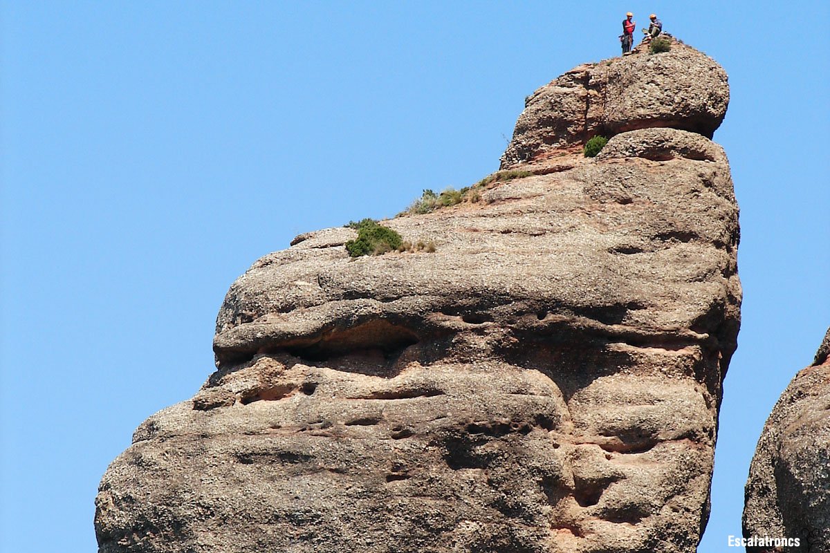 Ara iniciem el llarg marxant un metre a la dreta per atacar el darrer desplom, que un cop superat en artificial ens deixa a una vira a l’avant-cim. Des d’allí anem a buscar pel vessant nord el final de la GAM o pel vessant sud els darrers metres de la Xacó-Barés. 20 metres.