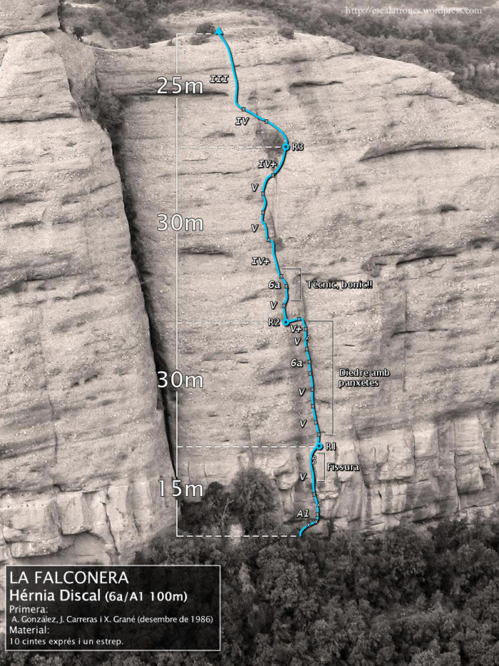Engrescador itinerari que permet guanyar la part dreta de la Falconera íntegrament en lliure, a excepció feta dels primers metres, on haurem de fer uns passos d’A1 o bé lliure extremadament difícil per superar una pronunciada panxa.