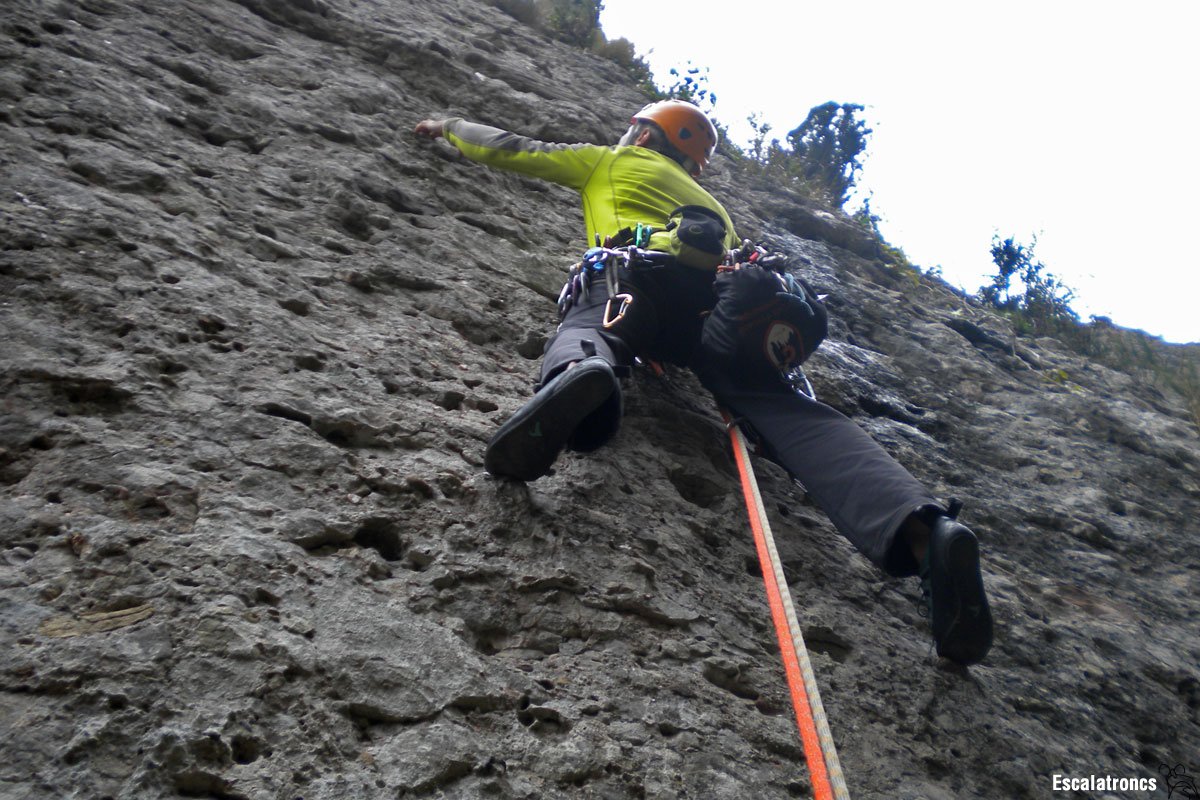 Les dues primeres tirades són de característiques molt similars, verticals, roca exquisida i ben cosidetes per no patir ni mica ni gens. El pas clau d’aquest primer llarg el trobem tot just a l’inici, una curta secció de 6a amb un emplaçament del segon parabolt del tot desafortunat, la roca et duu naturalment cap a l’esquerra i el parabolt està a la dreta (és el que té equipar des dels estreps?). Un cop superat aquest pas un xic més complexe la resta del llarg continua mantingut en V amb algun pas puntual una mica més picantó. 35 metres, 13 parabolts i un pont de roca.