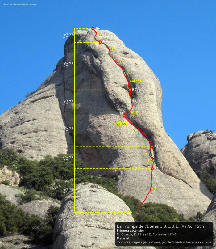 La Trompa de l’Elefant és un dels monòlits més característics de Montserrat. A les seves parets si han traçat línies que s’han convertit en grans clàssics de la història de Sant Benet: la Cerdà-Pokorski, l’Anglada-Guillamón, la Boy-Roca… Una altra clàssica que no pot faltar a la llista d’un bon montserratí és la GEDE, re-equipada pel Manel Guasch (un dels seus aperturistes), ens ofereix una escalada sobre fissures d’una bellesa clàssica que no pot deixar indiferent a ningú.
