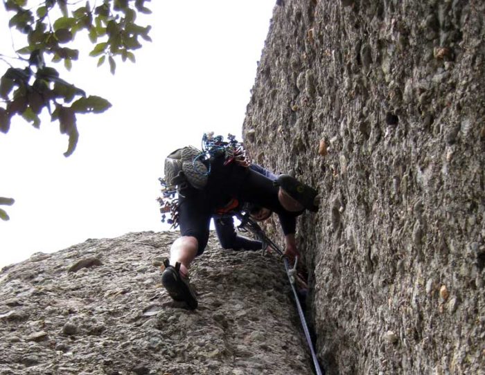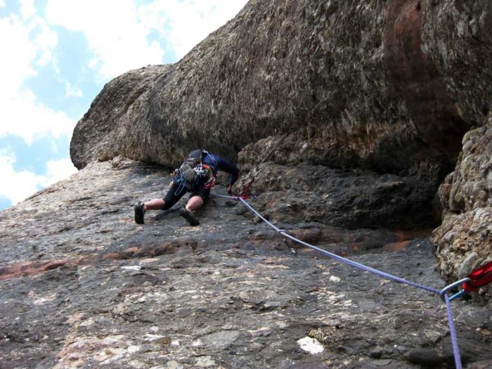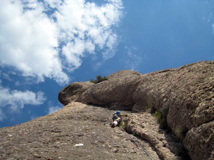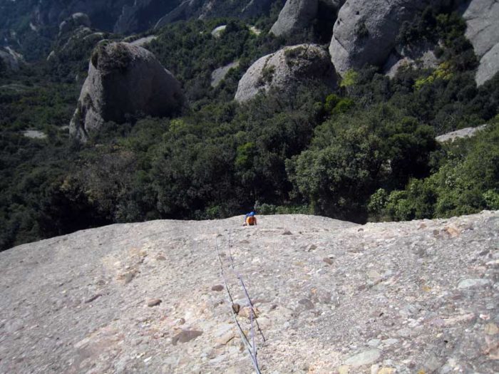 Sortim de la reunió i comencem a escalar just per sota la fissura. Als primers metres la roca té una adherència una mica dubtosa, però de seguida millora.