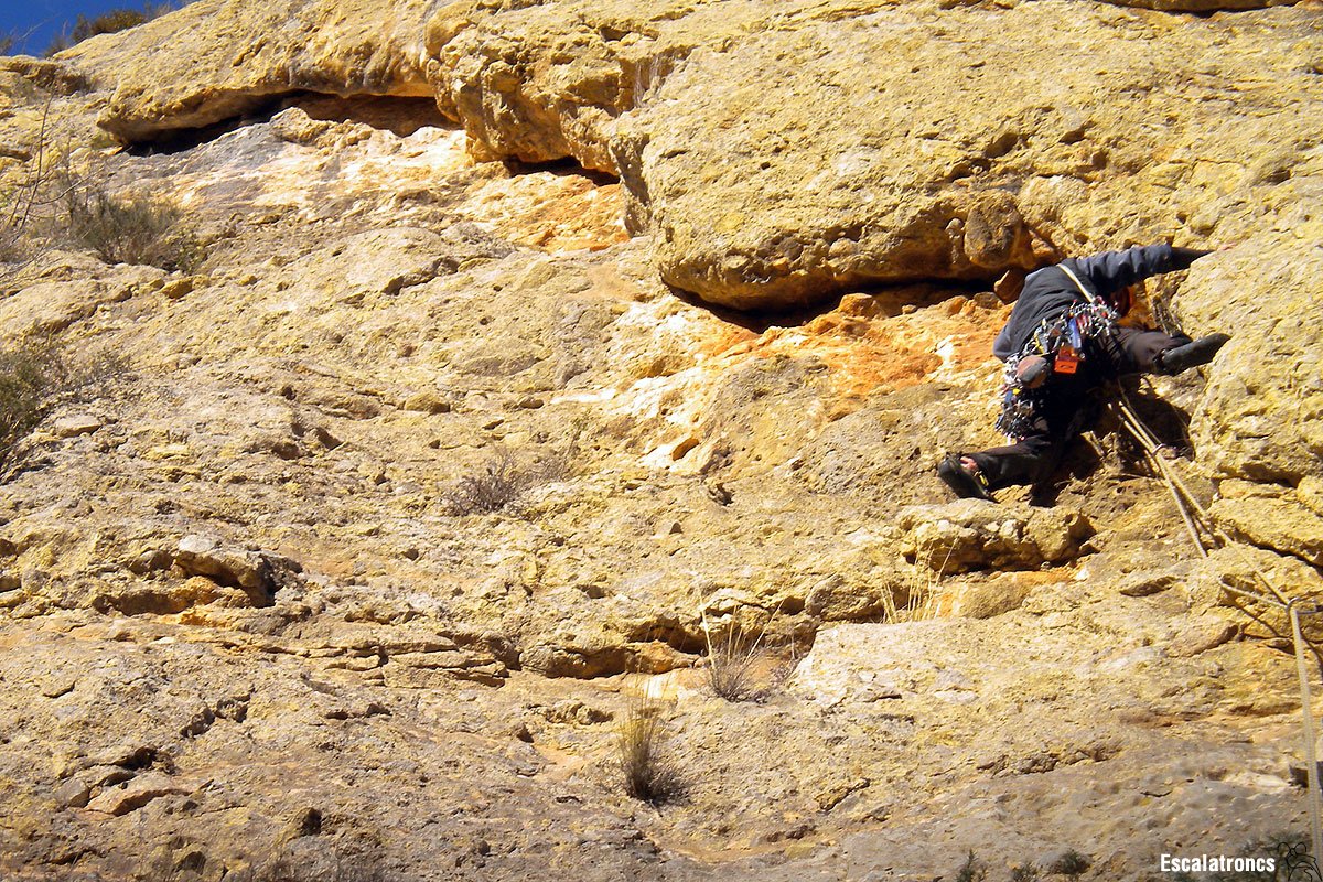 Llarg pertanyent a la via Tascons. Seguim la marcada fissura, aprofitant-la per assegurar-nos quan ho creiem convenient. A mitja tirada trobem el pas clau, una curta secció de moviments atlètics però amb molt bona presa. Quan la fissura es balma i ens barra el pas flanquegem a l’esquerra fins enfilar els darrers metres de l’agradable via Normal. 45 metres, 3 parabolts de la via Normal.