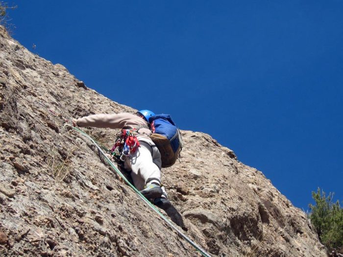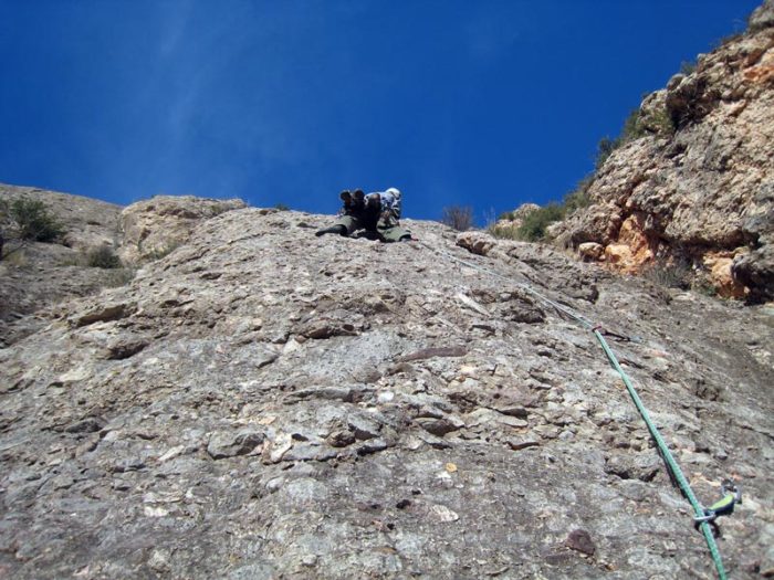 Sortim de la reunió per la dreta i comencem a escalar per la placa, que es va posant vertical, però sempre amb bona presa. Seguim per la placa amb lleugera tendència a l’esquerra per després tornar una mica a la dreta i entrar a un replà on es troba la segona reunió. Aquest llarg és especialment “disfruton”. 25 metres.
