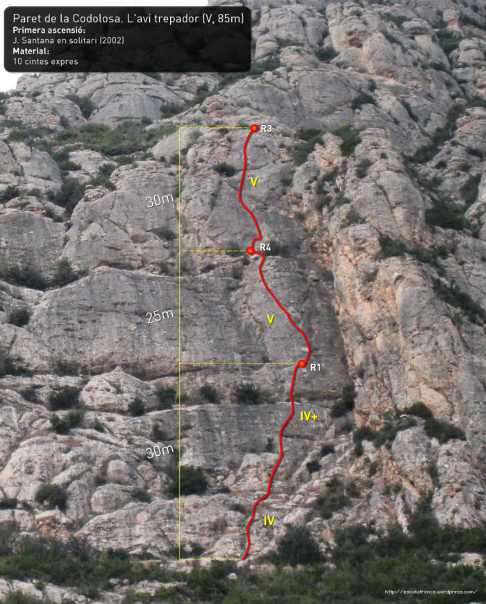 L‘avi trepador és una via que es travessa un seguit de plaques verticals de bona roca permetent-nos gaudir d’una escalada divertida i sense pretencions. L’itinerari està perfectament equipat amb espits, essent aquests més abundants a les parts més difícils. L’única pega és que no sigui més llarga, doncs se’ns fa curta. Escalada recomanable que es pot combinar amb altres de la mateixa paret.