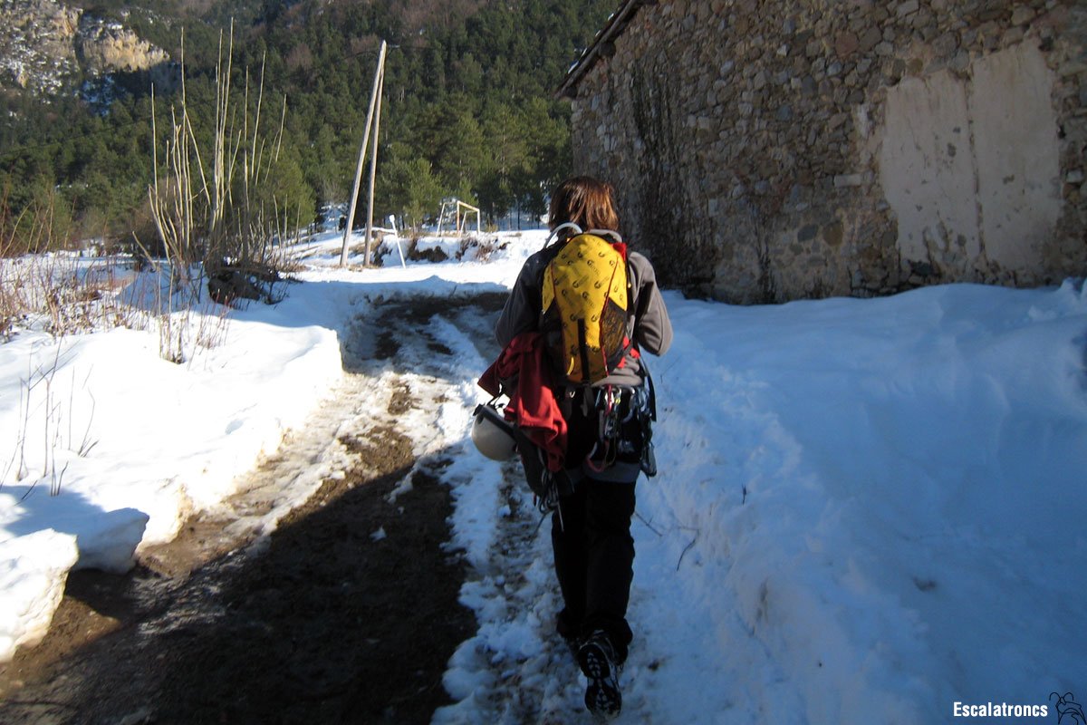 Un cop arribem a Malanyeu aparquem el vehicle al costat d’un camp de futbol. Seguim a peu per una carretera que es dirigeix cap a l’església i continuem fins que arribem a un mas. Just abans surt un corriol que s’endinsa al bosc; el seguim. Creuem una riera i un filat elèctric. Al cap de 5 metres comença un altre corriol poc definit a l’esquerra que, sense pujar al peu de la paret, va resseguint-la per sota fins a trobar el peu de via.