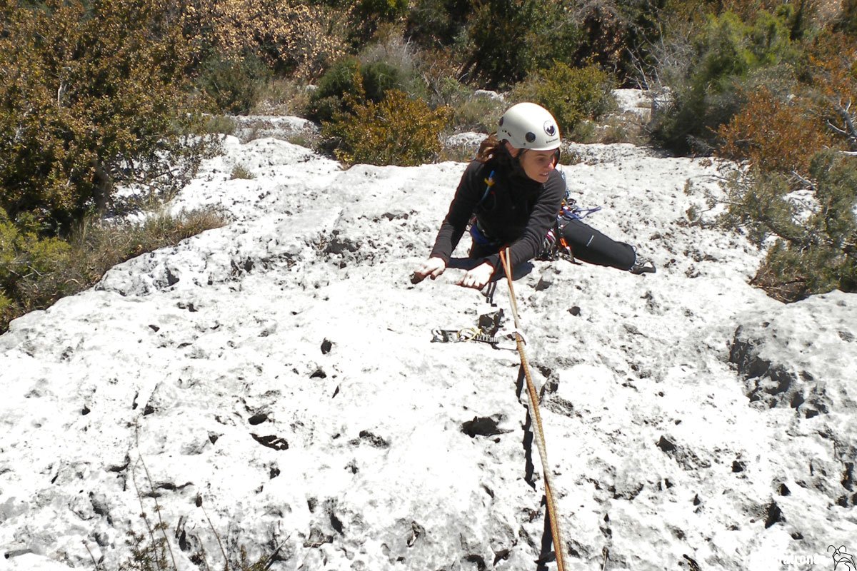 Avancem uns metres per un esperonet fàcil amb bona roca. Arribem a una peita lleixa i encarem un darrer tram vertical, fàcil i un xic trencat fins la reunió. 20 metres.
