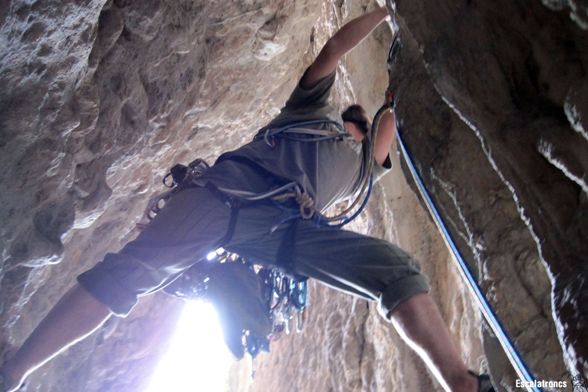 Iniciem la tirada sortint en X de la reunió, però aquest cop mirant cap dins de la xemeneia. De seguida abastarem una fantàstica estalagmita, que podrem llaçar com si fos el tronc d’una alzina. Continuarem recte amunt, encastant-nos un xic en algun punt fins que arribem a un pont de roca que hi ha al sostre de la xemeneia. A partir d’aquest moment s’inicia un flanqueig d’uns vuit metres per sortir de la xemeneia. Haurem d’anar en X, veient com es va obrint el buit sota els nostres peus. Anirem trobant fins a tres espits que van protegint la sortida. Un cop haguem xapat el darrer encara podrem llaçar un pont de roca del sostre. En aquest punt l’ambient és espectacular, donat que ja som pràcticament fora de la xemeneia i anem bastant oberts.