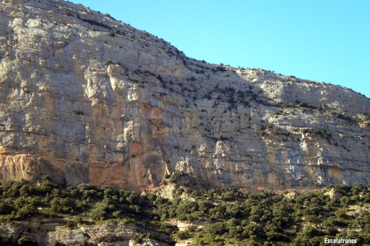 Des de la reunió veiem en diagonal a la dreta una alzina característica a la part alta de la paret. Hem d’anar cap allà traçant una gran diagonal per terreny fàcil. Just sota de l’alzina tindrem un pas una mica més dret, però gens complicat. Un cop a l’alzina podem muntar la reunió o seguir una mica més fins sortir de la paret. 55 metres.