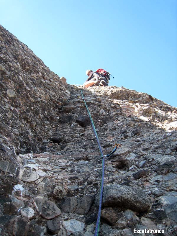 Sortim de la reunió cap a l’esquerra fins encarar un muret vertical però amb presa, aquest és el pas clau del llarg (V). Un cop superat la resta de la tirada és una agradable escalada en placa (IV) fins a la reunió que també força còmoda. Totes les reunions es troben equipades per rapelar. 25 metres.