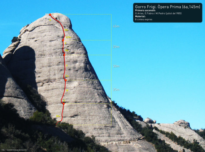 L‘Òpera prima és una de les vies “clàssiques” de la cara est del Gorro Frigi. Totalment re-equipada amb parabolts per Guillem Arias, un dels seus aperturistes, ens ofereix una ascensió directa, mantinguda i sobre molt bona roca.