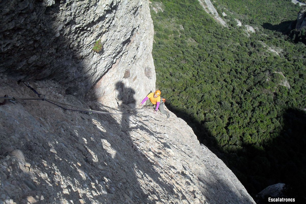 Deixem la fissura per anar a buscar la placa de l’esquerra. L’escalada esdevé un elegant flanqueig a esquerres fins que hem de tirar amunt, atacant un curt mur que nosaltres hem superat en artificial però que té mooolt de color en lliure (6a+?). Un cop superat el tram obliqüem de nou cap a l’esquerra resseguint una fissura que de seguida ens duu a la reunió. 35 metres.