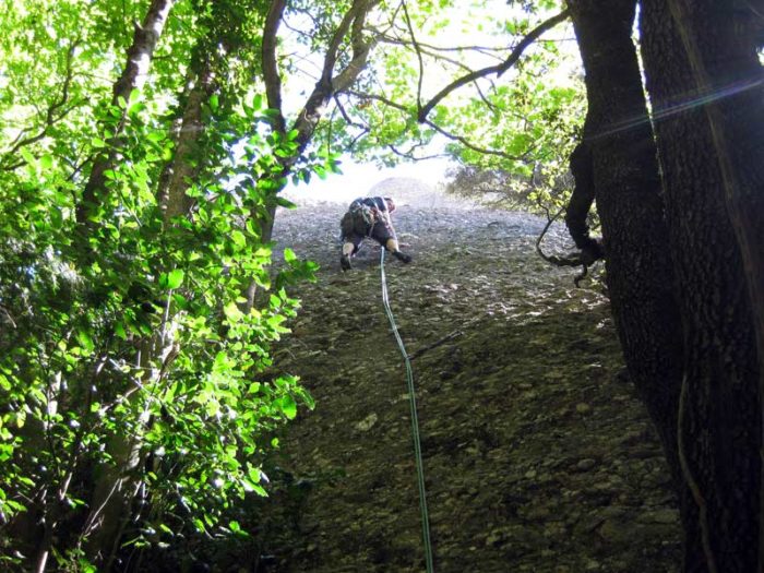 Sortim de la reunió enfilant-nos per una placa vertical però amb molt bona presa. Els passos més compromesos tornen a estar ben protegits. Al cap d’uns metres comença a perdre la verticalitat fins que arribem caminant a la reunió que fem a un arbre. 30 metres i tres espits.